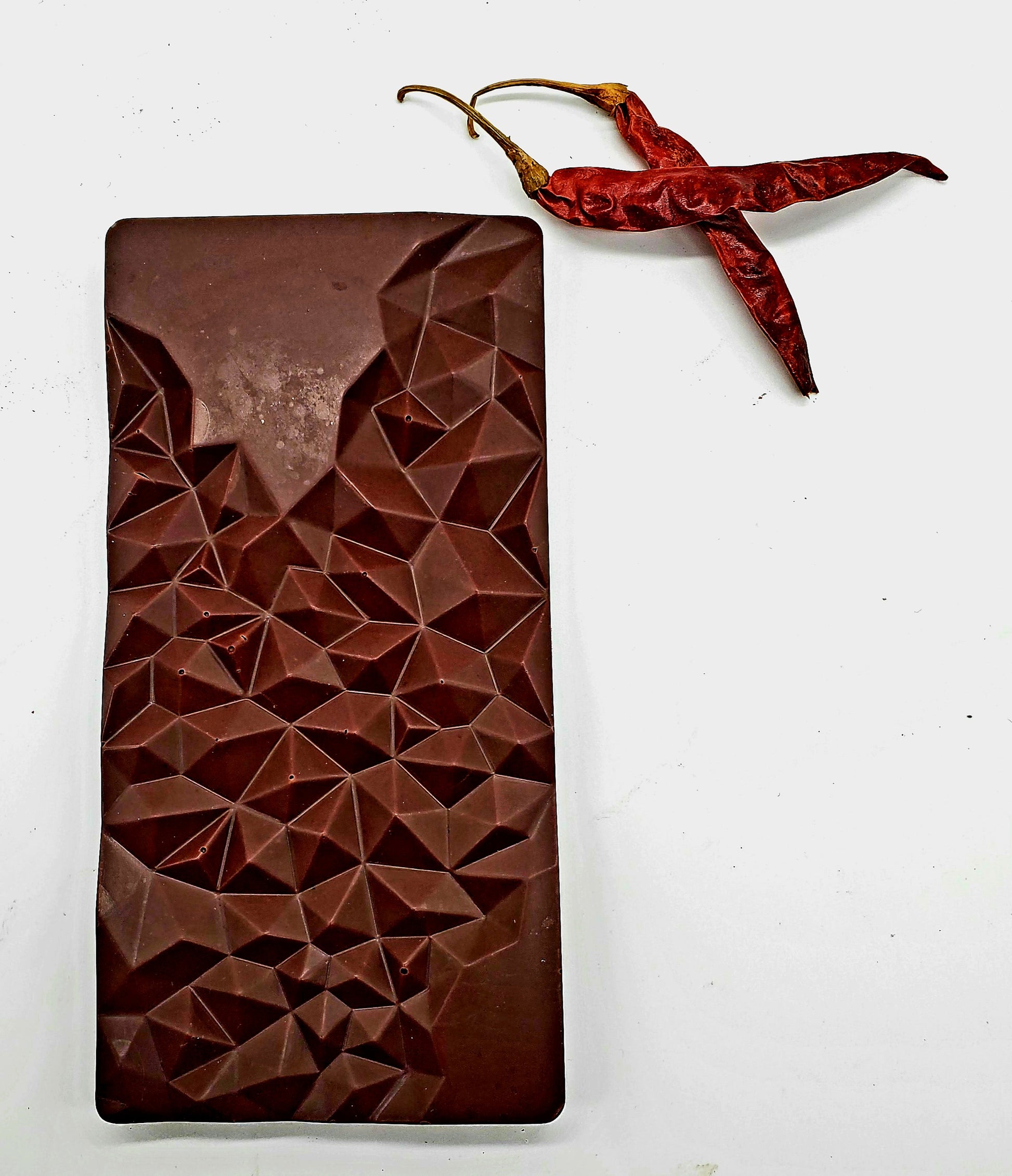Ingredients: Dark chocolate (cacao, organic cane sugar, organic cocoa butter), chile